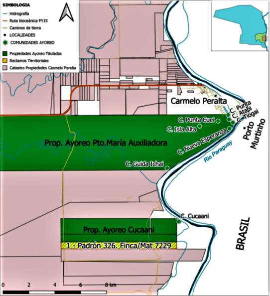 Gegenwärtig gibt es 2 titulierte Gebiete (Puerto María Auxiliadora und Cucaani) mit 11.000 Hektar. seitens der 11 anerkannten indigenen Ayoreo-Gemeinschaften. Die Gesamtfläche dieser Gebiete beträgt 20.400 ha, Das erste ist unterteilt in 10 anerkannte Gemeinschaften und 3 Siedlungen, die sich im Anerkennungsverfahren befinden. Dieses Land wurde von der Katholischen Kongregation der Salesianer (Congregación Católica Salesiana) und dem Apostolischen Vikariat des Chaco. In den letzten Jahren mit dem Bau der bio-ozeanischen Route und der internationalen Brücke hat sich der Druck auf diese Gebiete der Ayoreo-Länder, mit Fällen von Übergriffen, Abholzung, und der Gewinnung von Steinmaterial verstärkt, Es droht sogar die Zerstörung der Cucaani. Alle indigenen Ayoreo-Gemeinschaften im Distrikt sind in der Unión der Ayoreo-Eingeborenen von Paraguay (UNAP) zusammengeschlossen. Nach einer kürzlich durchgeführten amtlichen Erhebung beträgt die indigene Bevölkerung 835 Einwohner in 289 Behausungen. Die Ayoreo-Führer behaupten jedoch, dass die derzeitige indigene Bevölkerung auf etwa 2.000 Menschen geschätzt wird.