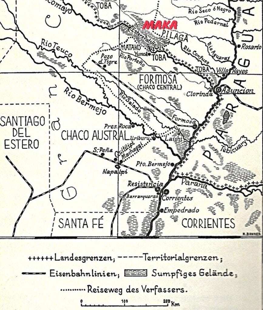 Der tschechische Forschungsreisende Frič hatte zwanzig Jahre zuvor diesen zweiten Fluss, den Río Confusio, der der Parantina Lagune entspringt, entdeckt. Er fand 1904 auf seiner Expedition zurr Erforschung des bislang in großen Abschnitten unbekannten Flusslaufes des Pilcomayo auch Spuren von unbekannten Indianerstämmen, darunter den Sotegraik. Zu Gesicht bekam er sie jedoch nicht. Allerdings fand er hölzernen Ohrpflöcke der Eingeborenen in ihren verlassenen Dörfern. Drei Jahre später gelang es Adalbert Schmied auf seiner Kanuexpedition die Sotegraik, die sich selbst als Maká bezeichneten, zu erreichen. Frič ordnete diese Indianer der Macikui-Sprachfamilie zu. Dafür sprachen seiner Ansicht nach Webstoffe, Waffen und Schmuck. Die Haartracht dieser Menschen deutete jedoch mehr auf eine Verwandtschaft mit den östlich benachbarten Pilagá-Indianern hin. Heute wird die Ethnie der Mataco-Guaicurú-Sprachfamilie, der Mataco-Mataguaya-Unterfamilie (die zwischen den Mak’a- oder Towolhi-Dialekten und den Enimagá- oder Kochaboth Dialekten unterscheidet) zugeordnet.