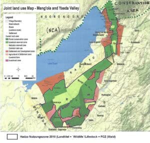 Common Land use (hellblau): in Endamaghan ist eine gemeinsame Nutzung zwischen Hadza und dem extensiven Weideland. Das Gebiet liegt zwischen dem Ngorongoro-Conservation Area (NCA), den Hadza-CCROs und der Siedlung. Gebiet ist als Pufferzone und als Hadza-Nutzung sehr wichtig.
