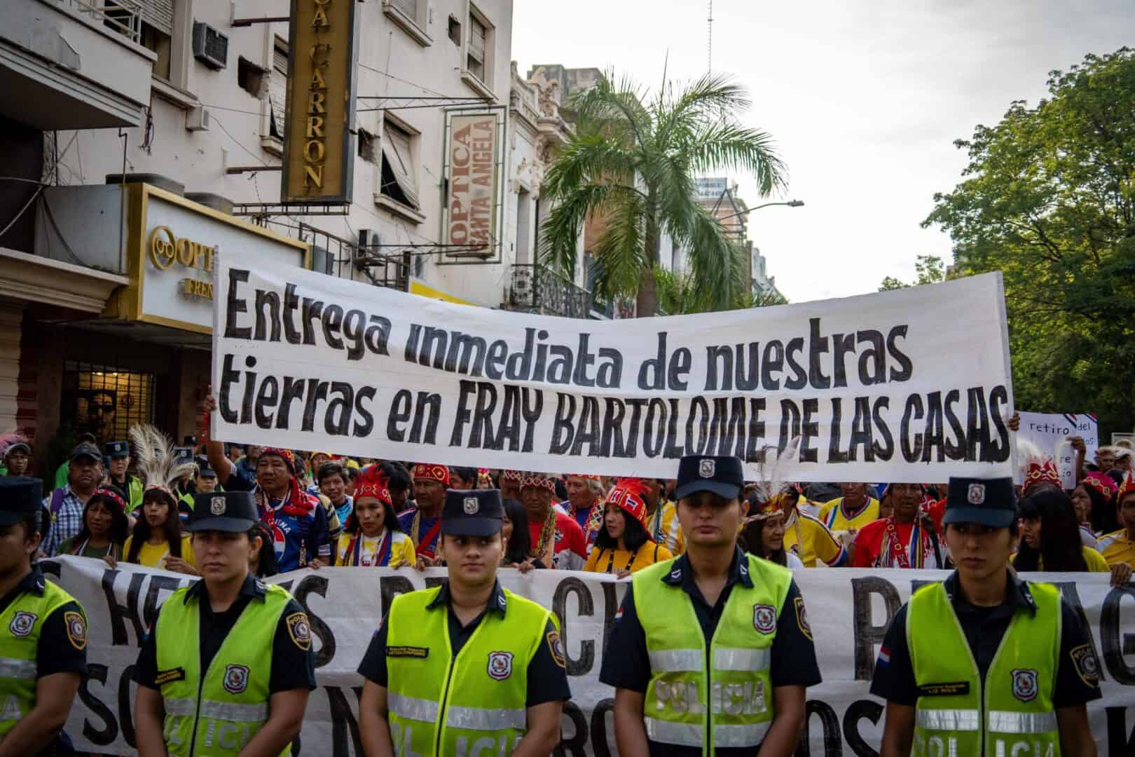 Titelbild: Polizeiabschirmung der Maká / Brückenbaustelle (o.) / Demonstrierende Maká im Februar 2024 in Asuncion – Text des Banners: Die Helden des paraguayischen Chaco sind wir, „die Maka“, Fotos: Tierra Libre