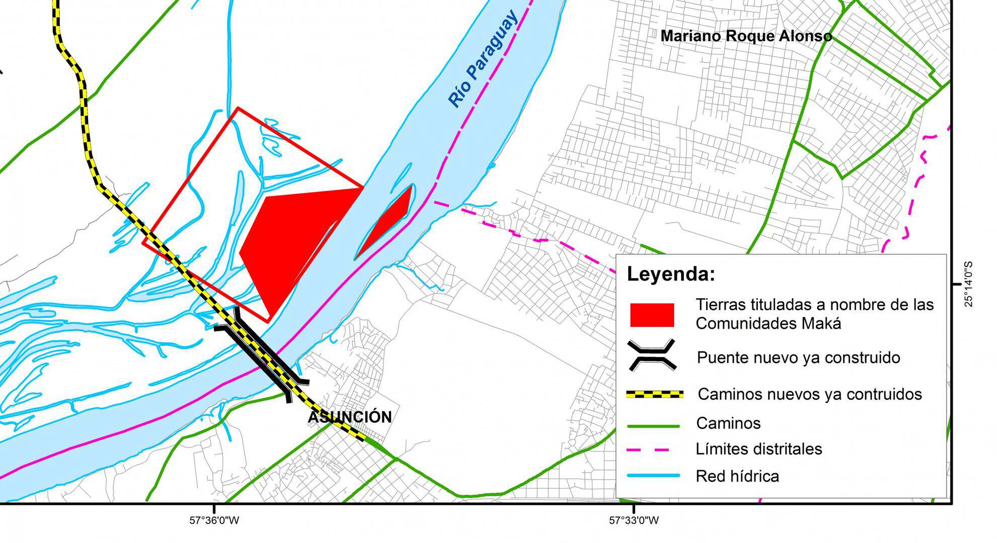 Diese staatliche Straßeninfrastruktur verstößt in jeder Hinsicht gegen das Recht auf Konsultation und vorherige Zustimmung der indigenen Völker, da sie direkt die Grundstücke des Volkes der Maká betrifft. Die Maká wurden weder vorher konsultiert wurden, geschweige denn, dass ihre Zustimmung zum Baubeginn eingeholt wurde. Wie Rdn von Tierra Libre im November erfuhr, ist die Brücke inzwischen fertiggestellt. Die zum Projekt gehörende nordwestliche Anschlussstraße verläuft über das Gebiet von „Bartolomé de las Casas“ – wie aus nachfolgender Karte von Tierra Libre zu sehen ist.